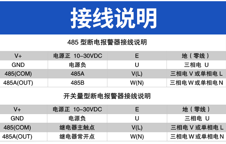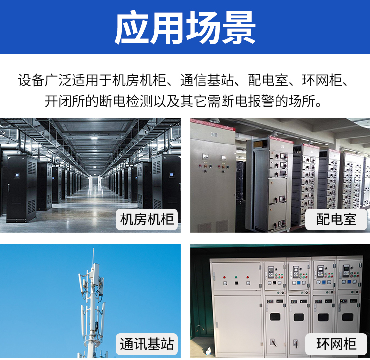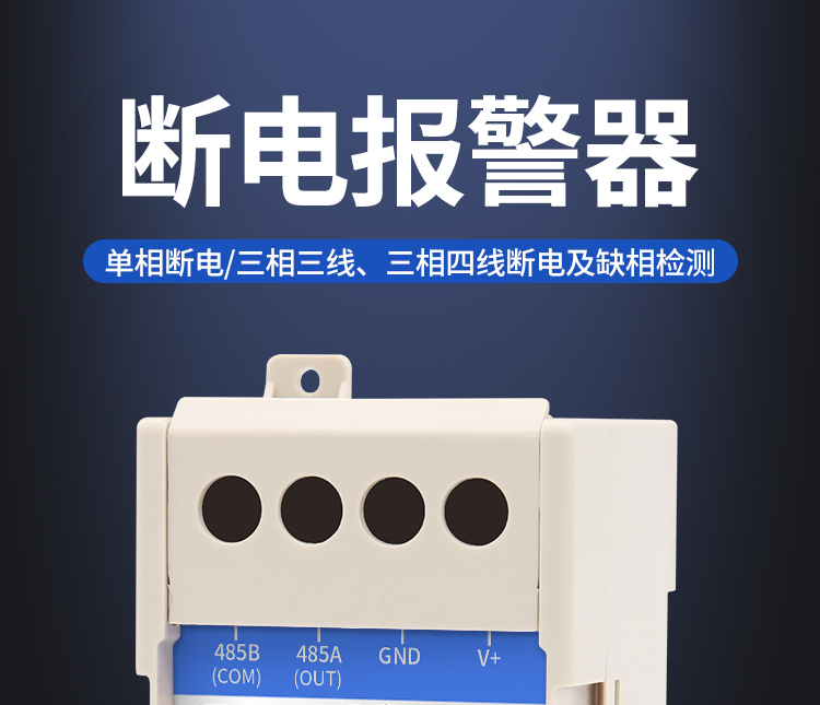 该报警器能够进行单相电断电检测,三相三线、三相四线断电及缺相检测。报警信号可选485输出,亦可选开关量干接点输出。485输出为标准ModBus-RTU,最远通信距离2000米,可直接接入现场的PLC、工控表、组态屏或组态软件。设备采用卡轨式外壳,即可壁挂安装也可现场安装于标准DIN35mm导轨,广泛适用于机房机柜、通信基站、配电室、环网柜、开闭所的断电检测以及其它需断电报警的场所。