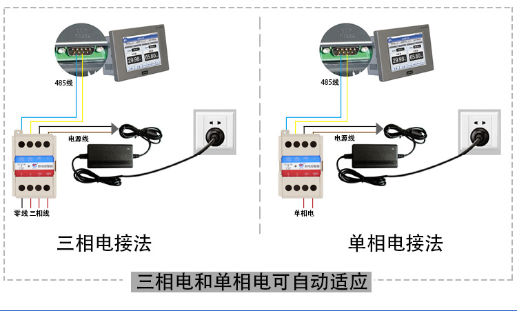 2、兼容检测单相AC220V、三相三相制、三相四线制AC380V,内部算法自动识别外部电网;