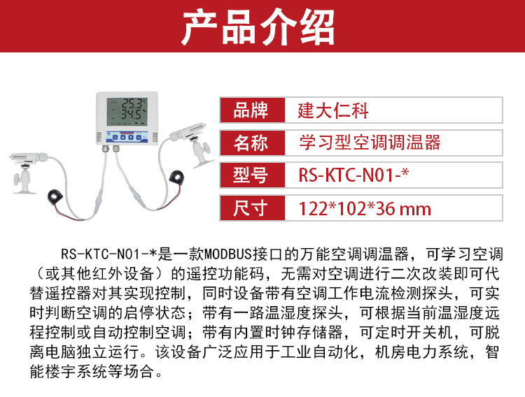 RS-KTC-N01 是一款MODBUS接口的万能空调调温器。带有学习功能,可以学习空调遥控器的控制码,从而代替遥控器对空调进行控制;带有批量下载批量导入功能,只需要学习一台空调遥控器的指令就可以,通过配置软件可以批量召测、批量下载,节省操作时间;带有远程控制和自动控制功能,可根据需要进行选择;带有内置温湿度传感器,并且可将温湿度通过液晶显示;RS-KTC-N01带有RS485接口支持MODBUS-RTU协议,对于支持此协议的PLC、单片机控制系统、力控、组态王、昆仑通态等组态软件均可以通过RS-KTC-N01对大部分柜式或壁挂式空调进行自动控制。