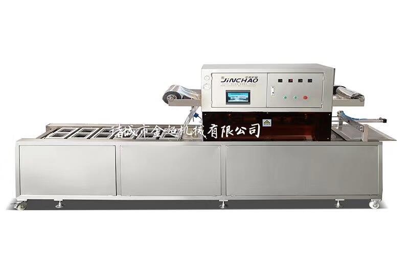 全自动连续封碗包装机是在普通真空包装机的基础上发展起来的新一代真空包装设备。它能将拉伸片膜通过该设备加工成形状后用复合片膜附在上面,抽真空后封口,最后分割成独立的产品的一种设备。适用于对各种食品,肉制品、海产品、果蔬、酱菜、冷却肉、五金元件等进行真空、封口包装。先将产品放在盒/碗里,再将盒/碗放在设备的放料区,盒/碗随着链条的向前运行进入到封口模具里,模具上升,在封口模具里将上膜附在盒/碗上,先抽真空(可根据用户产品包装要求,在抽真空的基础上,充氮气或混合气体进行包装)封口(上膜和盒/碗封在一起)冲切,最后排气,降模,包装好的产品随着链条继续向前运行,从出料口出料。设备还附加了光电跟踪对齐彩膜系统,为用户节约成本,提高工作效率,提高包装档次,还可以根据用户产品包装要求,配备自动打码系统。