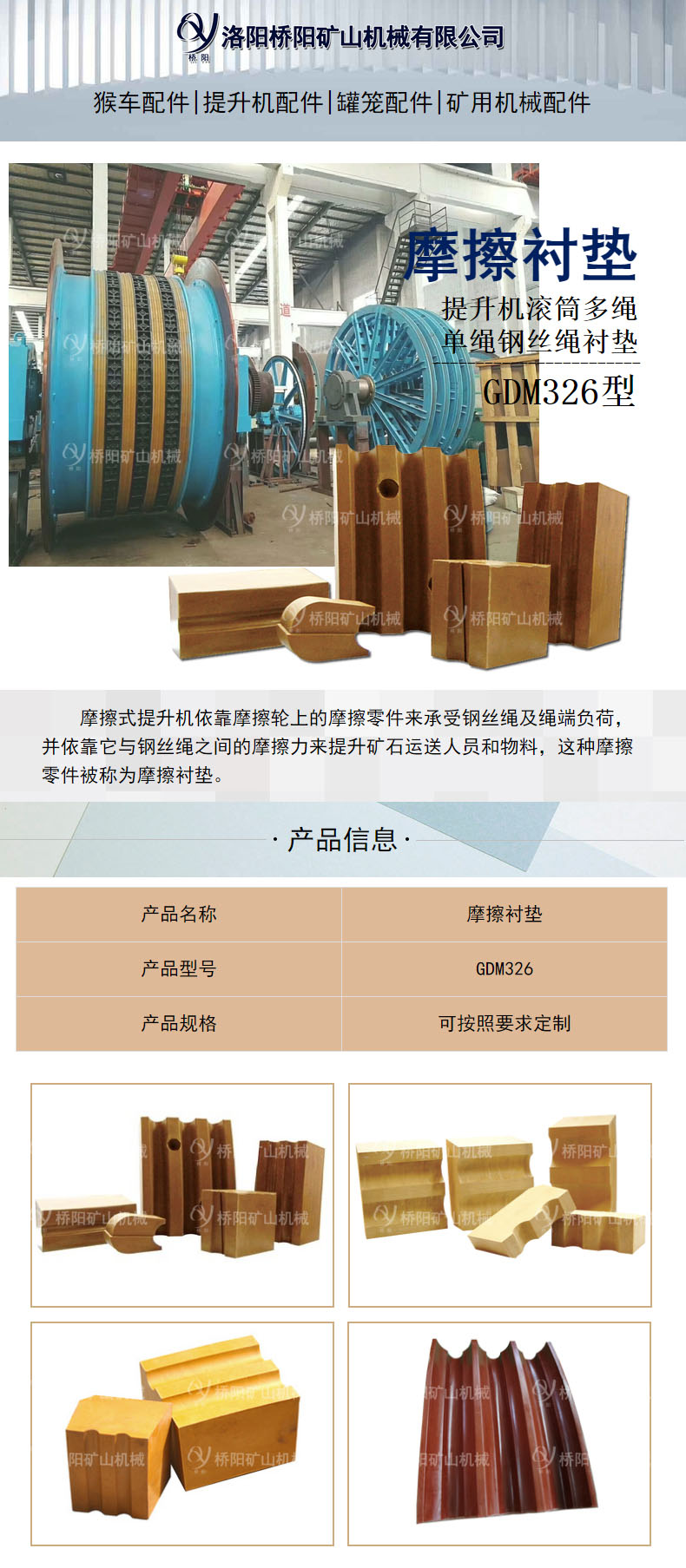 摩擦式提升机依靠摩擦轮上的摩擦零件来承受钢丝绳及绳端负荷,并依靠它与钢丝绳之间的摩擦力来提升矿石运送人员和物料,这种摩擦零件被称为摩擦衬垫。