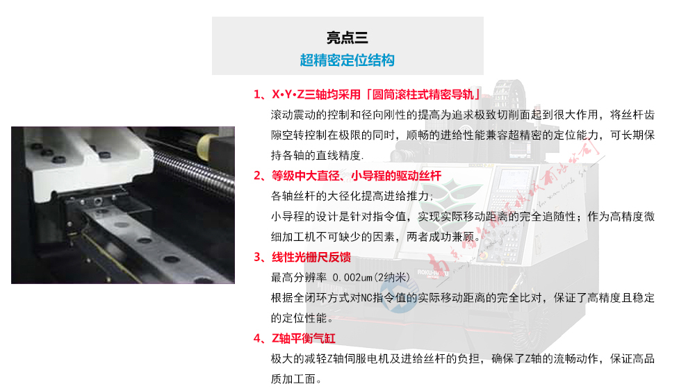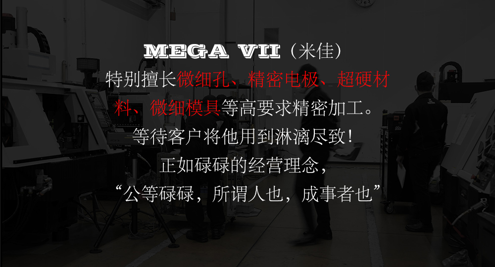 MEGA VII系列是三轴精密丝杆传动机型,配以2纳米分辨率的光栅尺,实现高追随性的全闭环反馈,具有极高的定位精度和重复定位精度。因此,MEGA VII系列擅长微细孔、精密电极、超硬材料、微细模具等高要求精密加工。