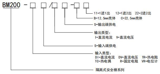 举例 1 输入:1 路 4-20mA,输出:2 路 4-20mA,工作电源:24V DC订货型号:BM200-DI/I-C12举例 2 输入:2 路 0-5V,输出:2 路 0-20mA,工作电源:24V DC订货型号:BM200-DV/I-C22举例 3 输入:1 路 PT100,输出:2 路 0-20mA,工作电源:24V DC订货型号:BM200-TR/I-C22