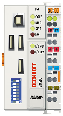 总线耦合器 BK 9500用于连接通用串行总线(USB)系统与电子端子排,这些端子排可以通过模块化方式扩展。一个节点由一个总线耦合器、1- 64 个任意数量的端子模块以及一个末端端子模块组成。