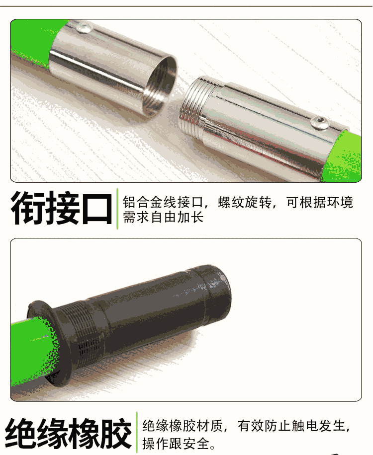 2、高压操作杆的分类: 10kv高压操作杆,35kv高压操作杆,110kv高压操作杆,220kv高压操作杆,500kv高压操作杆。