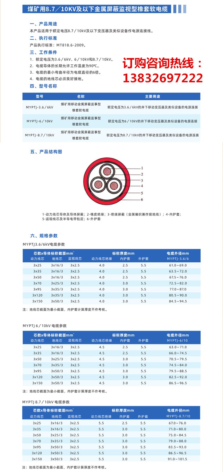 煤矿用高压橡套电缆MYPTJ-6/8.7/10KV监视型井下防爆阻燃安标认证 品牌 | 银顺牌 | ||