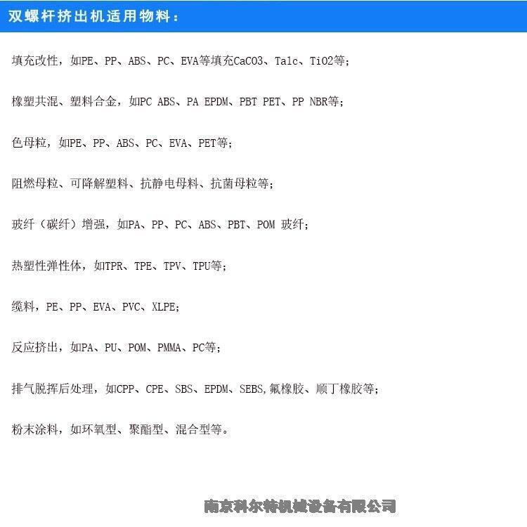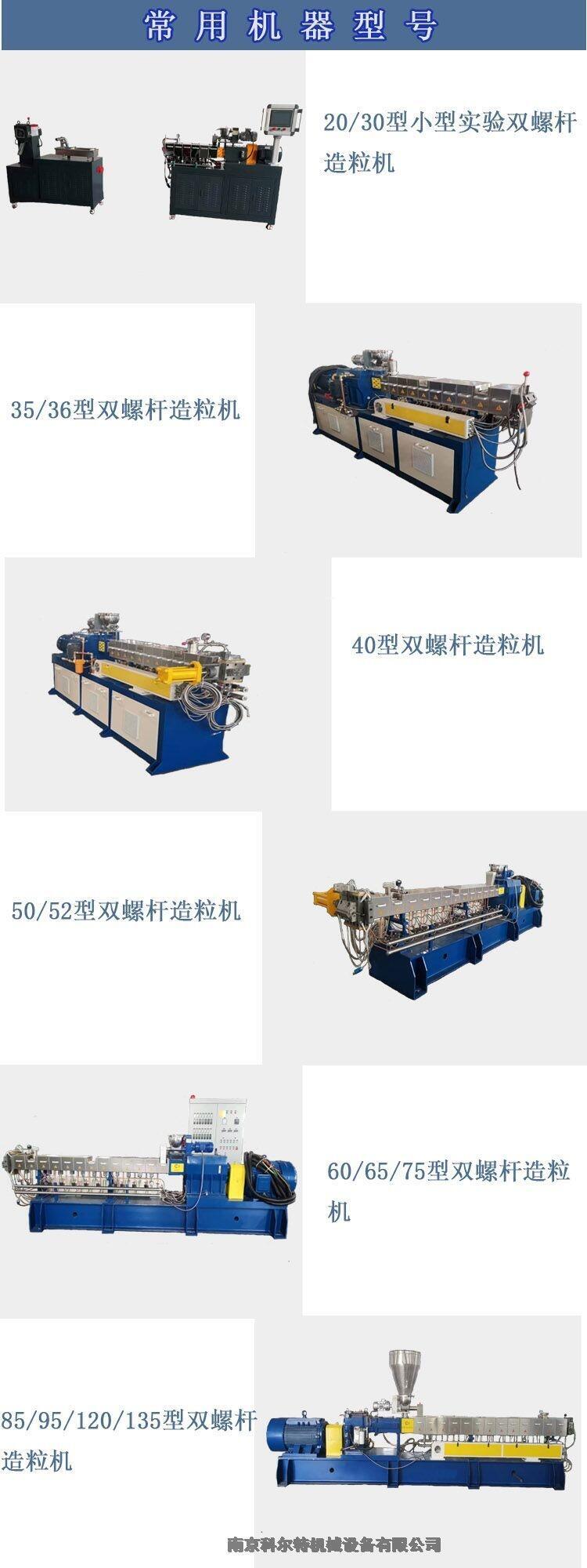 20双螺杆小型实验机,30双螺杆挤出造粒机,36双螺杆挤出造粒机,35双螺杆挤出造粒机,50双螺杆挤出造粒机,52双螺杆挤出造粒机,65双螺杆挤出造粒机,75双螺杆挤出造粒机,85双螺杆挤出造粒机,95双螺杆挤出造粒机,120机双螺杆造粒机,135双螺杆挤出机
