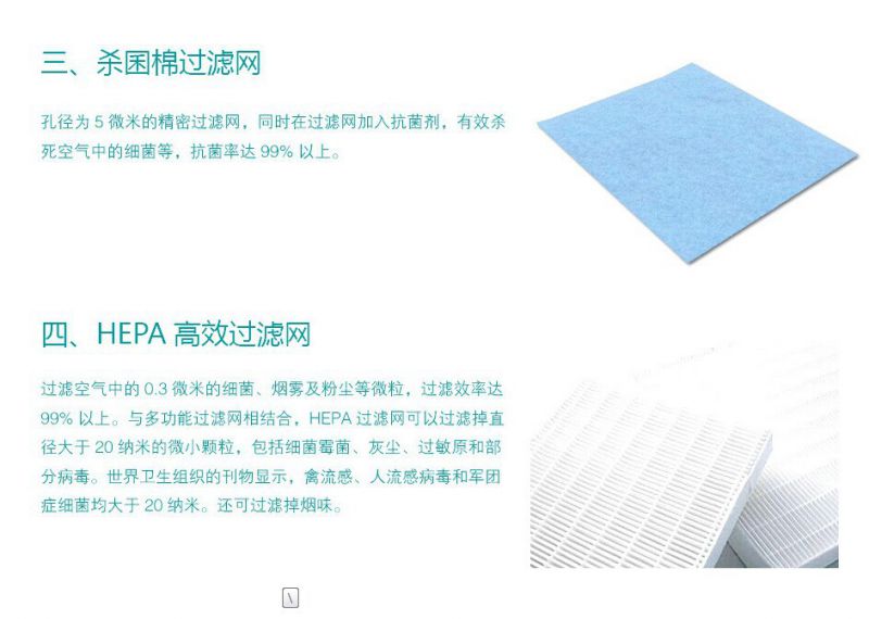2、过滤精度为99.9%,过滤孔径为0.01um,hepa过滤网是一种新型高放空气净化材料,在常温下不需要任何能源,就可以达到除尘(99.97%)、杀菌(99.99%)的目的。对于0.1微米或以上的粉尘(烟雾、划分、灰尘等)吸附率可达99.97%,对枯草菌具有高效杀灭能力,对一般细菌也由很强的抑制作用。