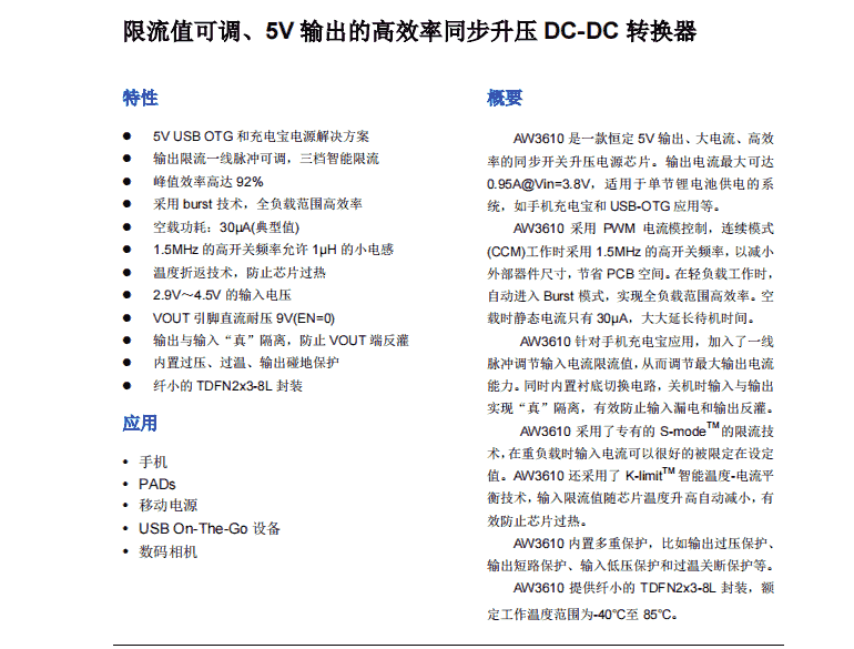 AW3610DNR 限流值可调、5V 输出的高效率同步升压 DC-DC 转换器