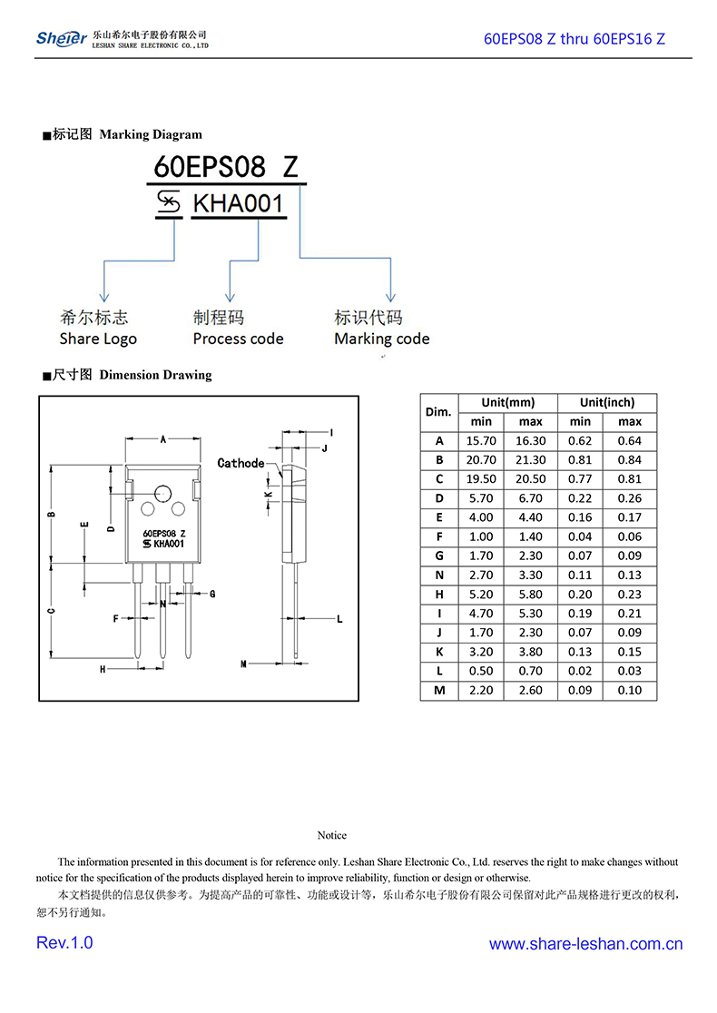 sheier/乐山希尔 全新原厂原装普通整流二极管:60EPS16 Z,60EPS14 Z,60EPS12 Z,60EPS10 Z,60EPS08 Z;正向整流电流:60A;反向峰值电压:600V~1600V;封装方式:TO-247AD。通用电源、电器、适配器、充电器、充电桩、工控、医疗设备、工业特种电源、高频电源、风光储新能源、逆变器、伺服电机马达等产品电路作整流、续流、开关、钳位、防反接、防逆回流等作用。GPP大芯片高电压大电流大功率插件式通用常规标准二极管60EPS16 Z,60EPS14 Z,60EPS12 Z,60EPS10 Z,60EPS08 Z。【页面标价非成交价,请联系详询报价】