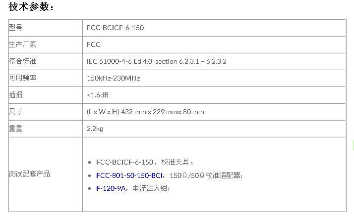 4 FCC-BCICF-3 电流注入钳校准装置,频率:10Khz-400Mhz,适用型号:F-120-5, F-120-7A, F-130-3 ,长*宽*高(250mm*177mm*175mm),重量:2.5kg,电压驻波比:<2:1