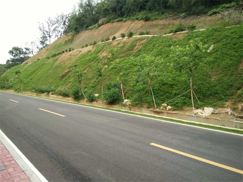 边坡植物防护的主要目的是固土护坡、防止冲刷,兼有美??化环境的功能。一般应选择干旱、瘠薄、根系发达、覆盖度好、易于成活、便于管理、同时兼顾景观效果的草本或木本植物。边坡以种植草本地被为主,根据不同地段的实际情况,采用丛植、列植等绿化模式,尽量做到乔、灌、花、草搭配,形成不同景观的植物群落。