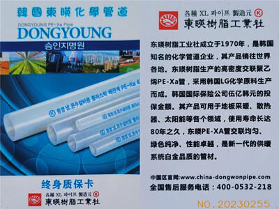 韩国东暎树脂工业社,成立于1970年,是韩国历史悠久知名的化学管道企业,其产品销往世界各地,东暎树脂工业社生产的高密度聚乙烯PE-Xa管,采用韩国LG化学原料生产而成,韩国国际保险公司全球联保10亿韩元的投保金额,其产品可用于地面采暖,散热器,太阳能等各个领域,使用寿命长达80年之久,东暎PE-Xa管交联均匀,绿色纯净,性能卓越,是新一代的供暖系统白金品质管材。