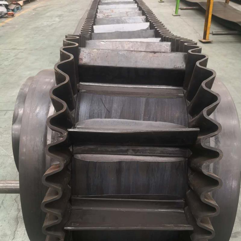 炜泰大倾角波状挡边输送带由基带、挡边、横隔板三部分组成。挡边起防止物料测滑撒落的作用。橡胶皮带当中大倾角挡边带是橡胶输送带当中技术含量非常高的一种特殊产品,而它的隔板部分对于硬度、磨耗、挺性等指标要求非常高大倾角挡边带隔板,其具有高硬度、耐磨、表面光滑不粘物料,使用寿命长的优点。挡边输送带可沿水平、倾斜、垂直和变角方向输送各种散装物料,无论是煤、矿石、沙子还是化肥和粮食等。400mm粒度以下粒度不限,输送量可从1m 3 /小时至6000m3/小时任选。基带的要求:挡边输送带基带要求具有一定的抗拉强度和耐磨性。其中对留有空边的挡边输送带,为了适应角度该向的要求,胶带的纵向要有柔软性,横向则要求一定的刚性。公司生产的挡边输送带采用特殊结构的横向刚性基带,解决了大规格输送带在回程过程塌带现象。基带的构造:基带是由上覆盖胶、下覆盖胶、带芯和横向刚性层四部分组成。上覆盖胶厚度一般为3-6mm;下覆盖胶厚度一般为1.5-4.5mm,带芯材料承受拉力,其材料可以是棉帆布(CC)、尼龙帆布(NN)、聚酯帆布(EP)或刚绳芯(ST)。为了增加基带的横行刚性,在芯体上、上假如特殊加强层,称横向刚性层。基带的宽度规格,与普通胶带相同波形挡边输送带被广泛引用与港口、冶金、矿山、电力、煤炭、铸造、建材、粮食