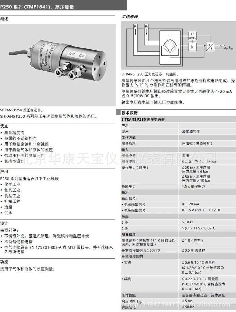 优点 .测量精度高 ·坚固的不锈钢外壳 ·用于测量腐蚀和非腐蚀膜 ·用于测量气体和液体的差压 ·带温压补偿的测量元件 ·紧凑型设计 应用 P250系列差压适合以下工业领域 ·化学工业 ·制药工业 ·食品工业 ·机械工程 ·造船 ·供水 设计 主要部件: ·不锈钢外壳,压阻式原理,陶瓷膜片和温压补偿 ·不锈钢过程连接 ·电气连接符合〔N 175301-803-A或M12圆接头,并可选择永 久电缆连接 功能 适用于气体和液体的差压测量。