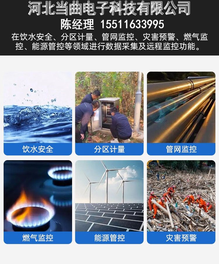 可接流量计、水表、各类智能流量计量仪器(IC射频卡数据存储);可智能语音播报,防拆卸预警功能。电源管理及避雷措施、天线可外置