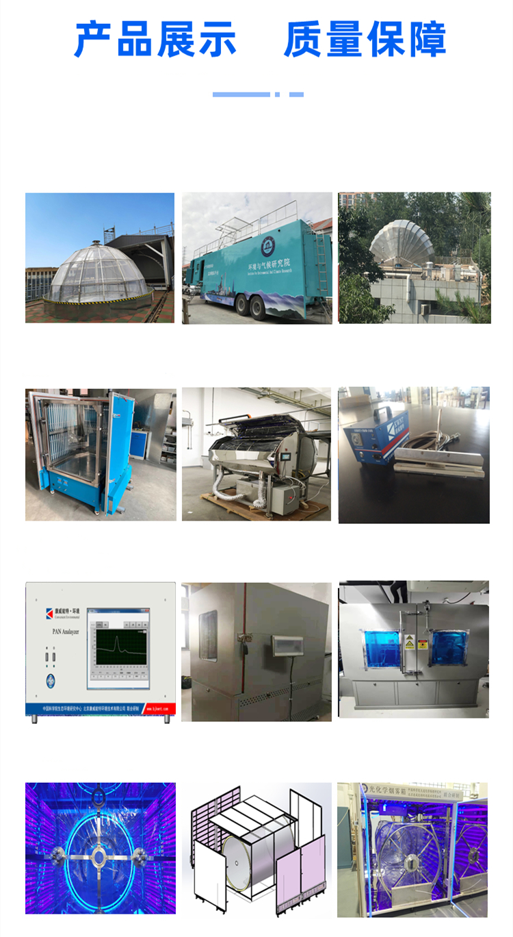 组成部分 | 由主体部分、空气模拟系统、配气系统、光照模拟系统、气体净化系统、气体发生系统、烟雾箱反应系统和中央集成控制系统等部分组成 | ||