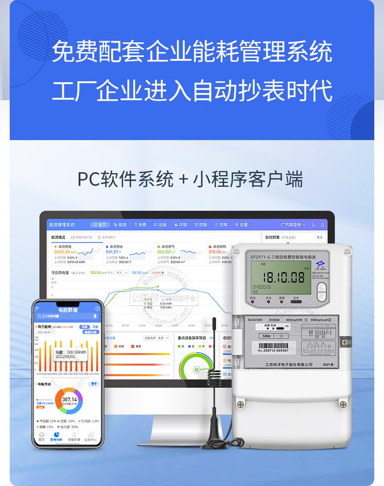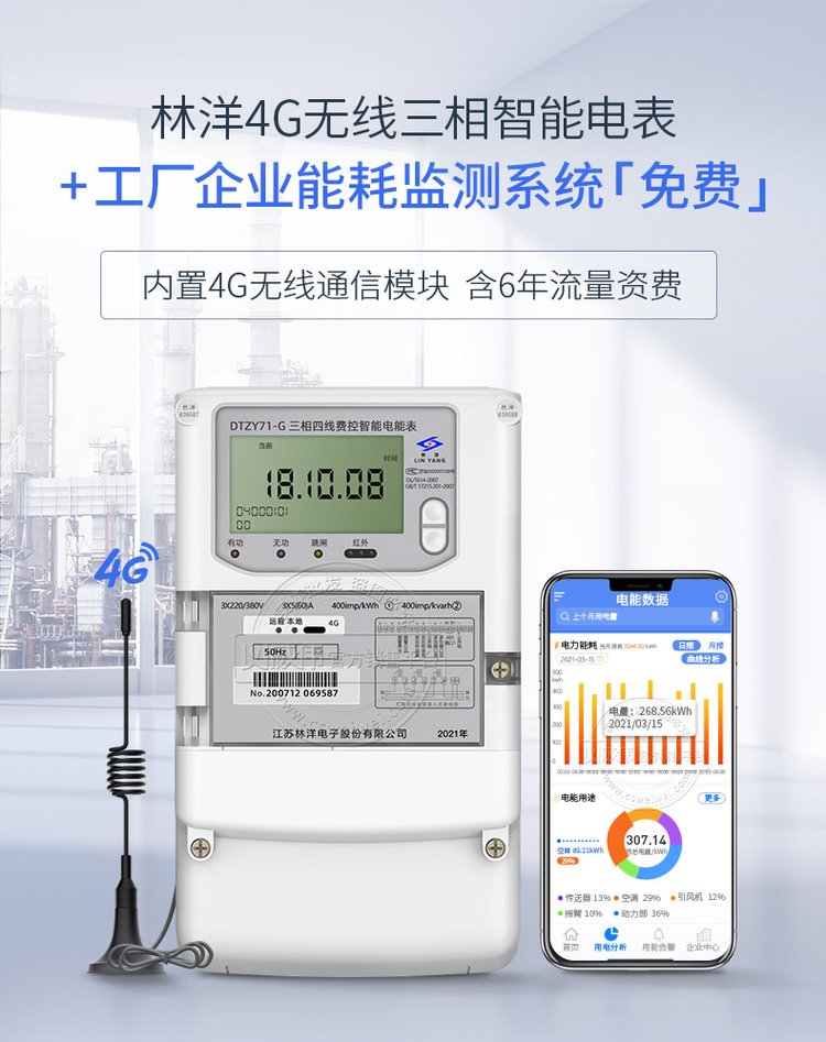 三相4G无线智能电表,无需布线,挂表即可联网实现远程抄表,免费配套能耗监测系统还能实现远程控制,尖峰平谷分时计量,数据报表统计等功能,帮助企业掌握能源支出成本。