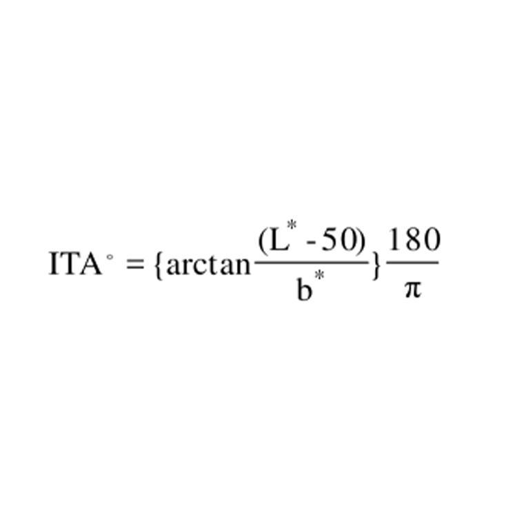 ITA°individual type angle指个体类型角,通过皮肤色度计或反射分光光度计测量皮肤L*a*b颜色空间数据来表征人体皮肤颜色的参数,计算公式如下: