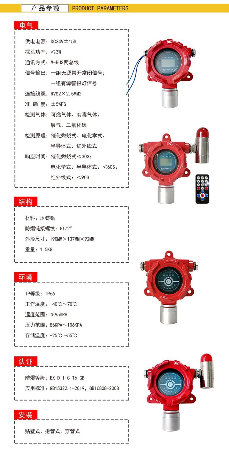 液化气站检测可燃气体探测器 RT液化气浓度报警仪器 ?丙烷气体报警器是主要由气体探测器和气体报警控制器两部分组成,采用进口催化燃烧式传感器,可上传DCS、PLC系统。探测器属隔爆型,防爆等级为EXD II CT6 Gb,是用于检测空气中丙烷气体的含量,当丙烷气体的浓度达到或高于预定水平时,探测器会输出信号,气体报警控制器立即发出声光报警并驱动排风或电磁阀等其他外设动作,防止火灾、中毒事故。