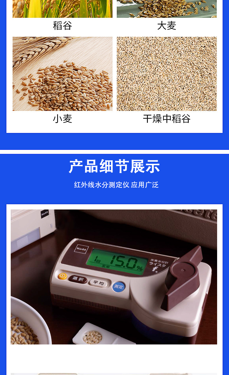 测量精度 | 干燥法的标准误差为0.5%以下(水分低于20%的全部样品)105℃法:±0.5%(干燥中稻谷除外) | ||