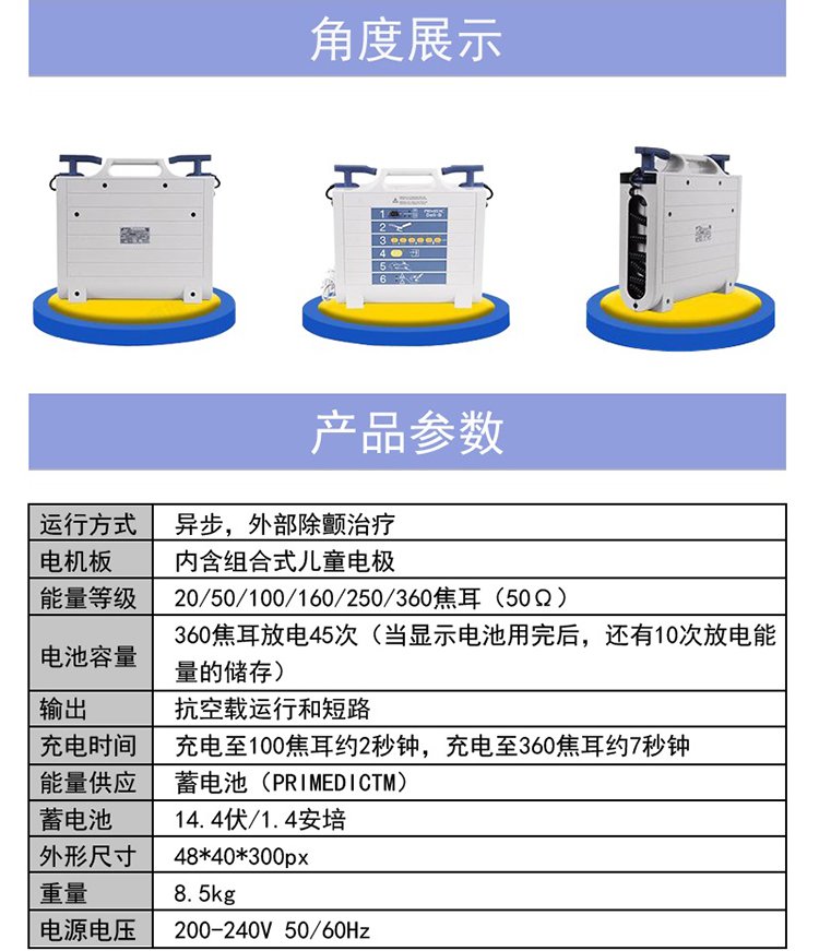 单次充电时间 | 充电至100焦耳约2秒,充电至360焦耳约7秒 | ||