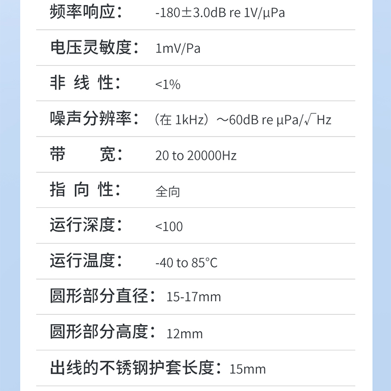 灵敏度 | -180 dB re 1V/μPa | ||