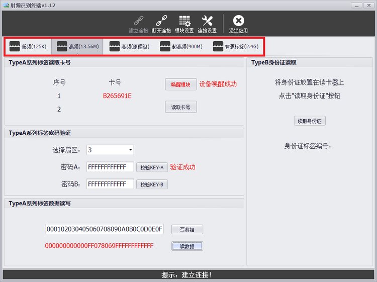 RFID模块涵盖全部主流的频段,包括低频、高频、超高频和微波,支持125K读写卡、125K只读卡、IC TYPEA卡、身份证TYPEB卡、UHF 6C卡、2.4G有源标签卡。