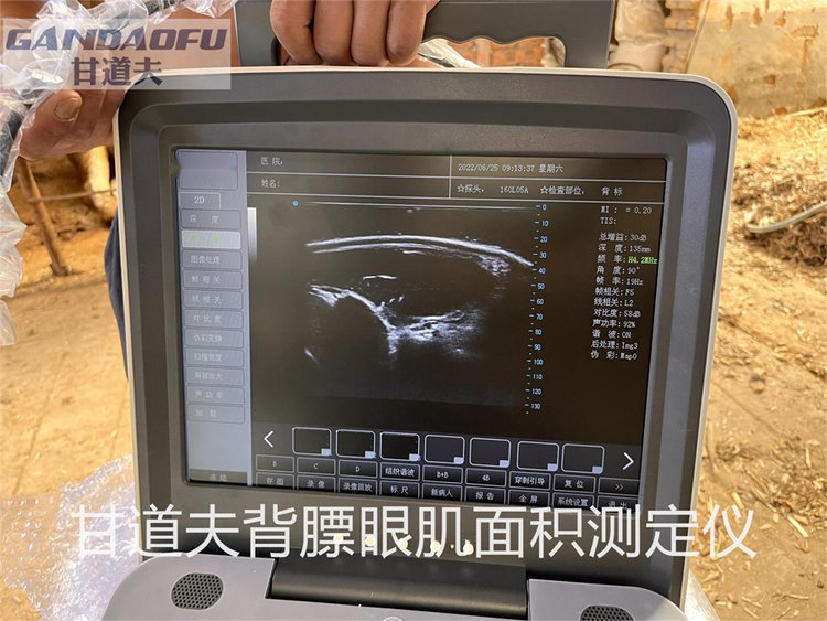使用甘道夫背膘眼肌面积测定仪可以快速检测猪牛羊背膘厚度瘦肉率眼肌面积,脂肪沉积等相关繁殖育种改良数据,具有无线连接,清晰度高,操作方便,简单易学,性价比高等众多优势, 肉牛背部脂肪厚度(背膘厚)和眼肌面积大小,是屠宰企业对育肥牛定级定价的主要依据之一,很多企业把背部脂肪厚度10毫米作为基准,大于10毫米时定为A,小于10毫米时定为B级,