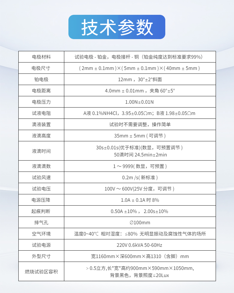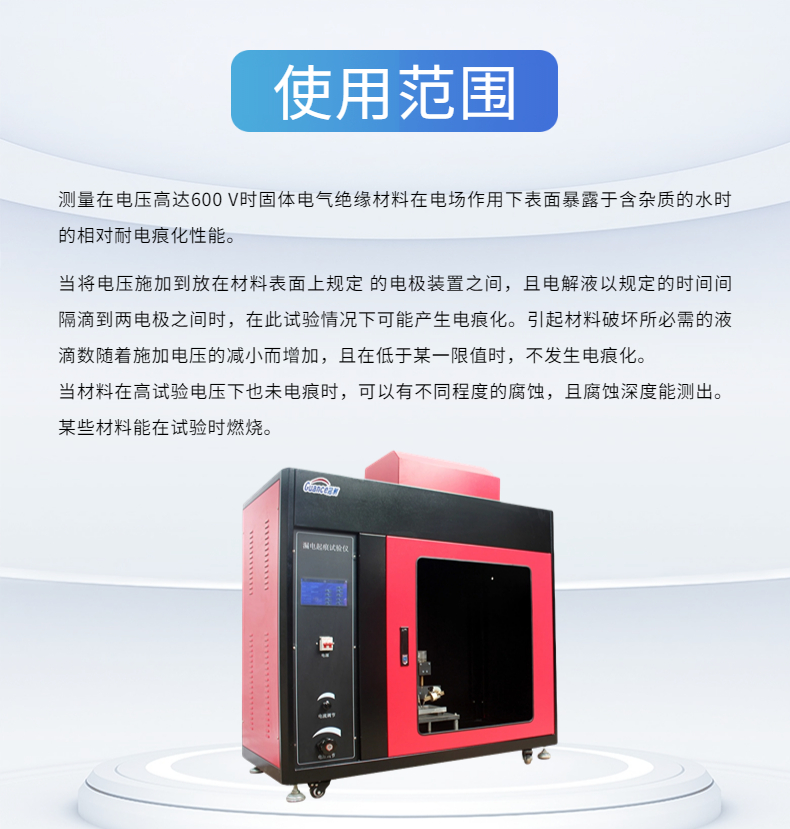 适用范围 | 测量在电压高达600?V时固体电气绝缘材料在电场作用下表面暴露于含杂质的水时的相对耐电痕化性能 | ||
