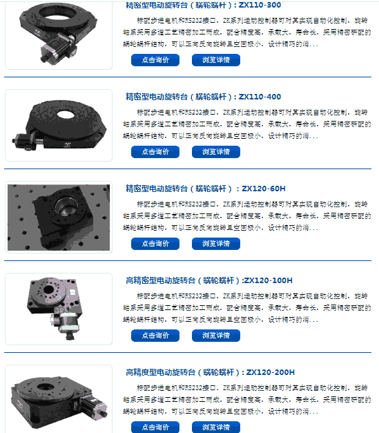 标配步进电机和RS232接口,ZK系列运动控制器可对其实现自动化控制。电动旋转台可平放使用也可立式使用,可与其他种类台子组成多维电动调整台。可增加限位功能,增加初始零位 ,换装伺服电机,加装旋转编码器,接受产品的改制和量身定制。