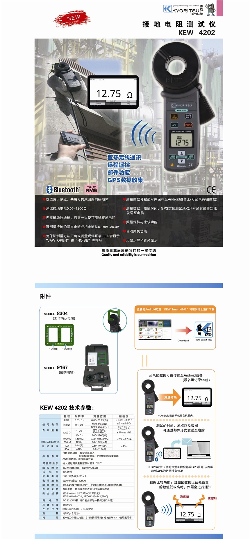 测量数据可被显示并保存至Android设备上(可记录99组数据)。