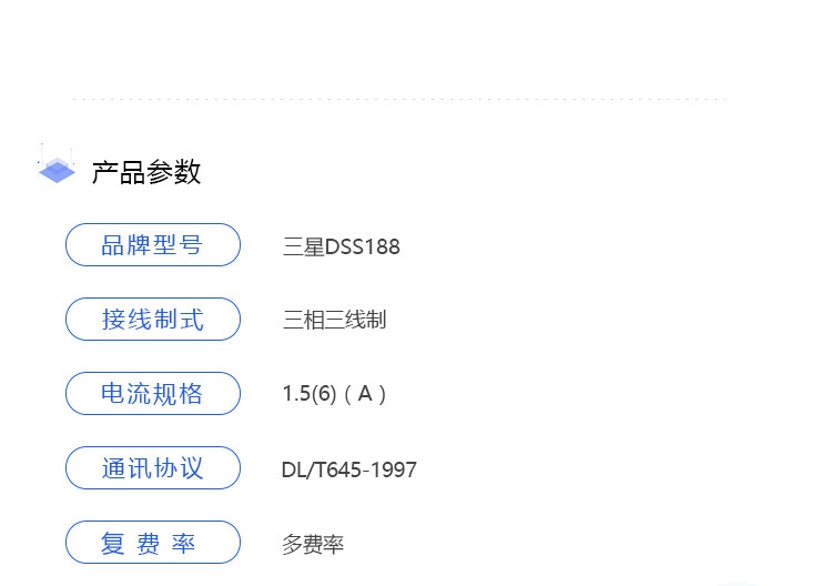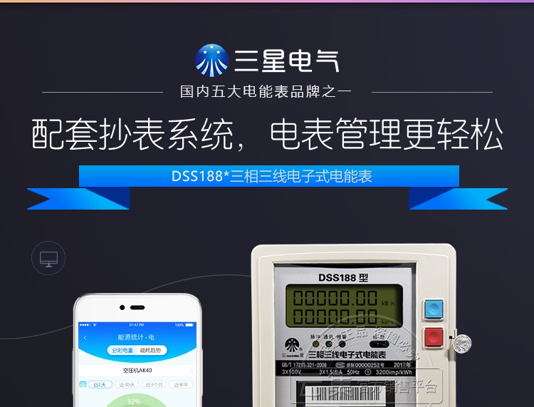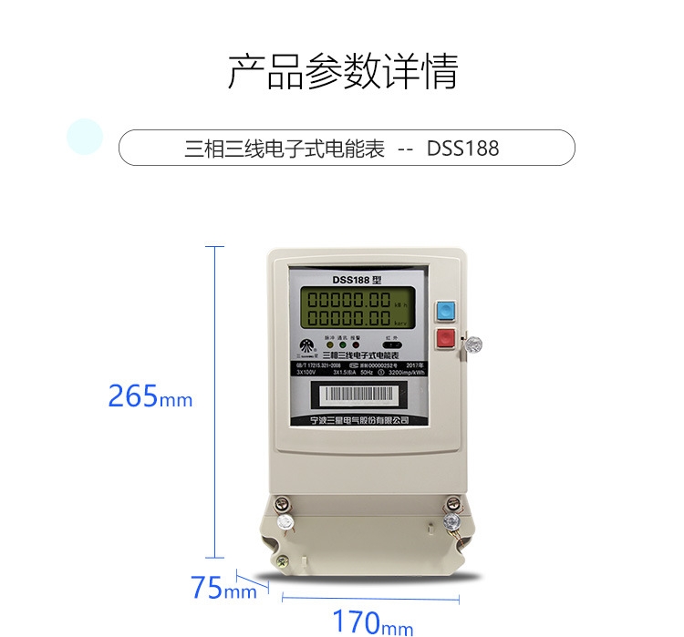 三星DSS188三相三线电子式电表宁波三星电气研发生产的三星三相三线电表,三星电气一直是国家电网和南方电网的前五大电表供应商,具有质量好、安全稳定、读数精准、寿命长等特点,功能具有:计量正反向有无功电量、分时付费率、防窃电等,可配套远程抄表系统,能耗监测系统。