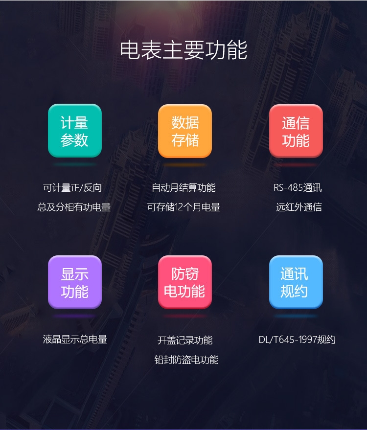 可通过按键、红外掌机及RS485通讯口抄表,配合抄表系统,可抄读电表的各项电量数据,支持DL/T645-1997多功能电能表通讯规约。