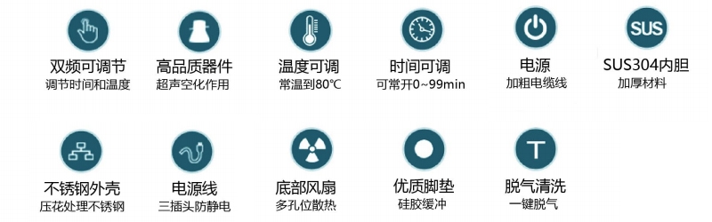 型号 | 容量(L) | 超声功率 | 超声频率 | 内槽尺寸(L*W*H) | 加热功率 | 时间 | 功率调节 | 脱气 | 加热温度 | 净重(Kg) |