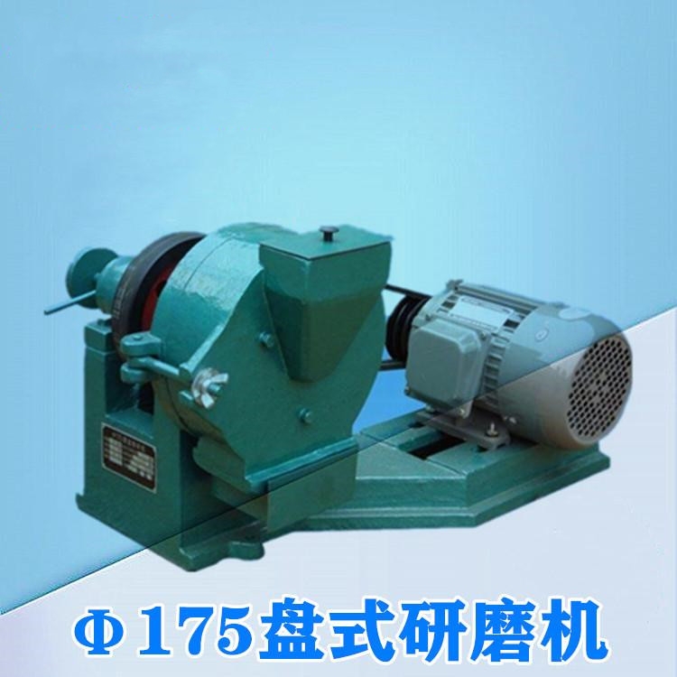 Ф175盘式研磨机主要由支架、轴承座、研磨座、动磨盘、定磨盘、活动研磨盖、皮带轮及电机组成。