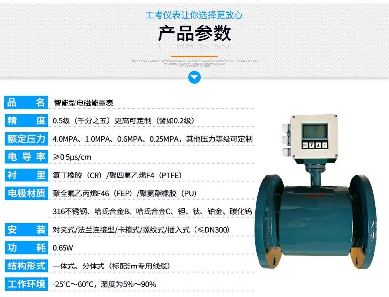 智能电磁能量表具有温度传感器检测、励磁报警和空管检测功能,具有自诊断、故障显示和断电数据保护功能,具有高清晰度宽温型大屏幕LCD液晶显示,可显示温度、流速、流量、热量等参数。