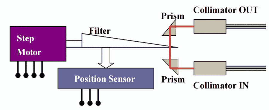 Zg introduces a new miniature variable attenuator for application in either the C or L band. The attenuator offers excellent wavelength dependence and ripple, low polarization dependent loss (PDL), and improved thermal stability. The attenuator provides an economical solution to managing optical power. Reflective optics permit same-side jumper exit and enable easy panel mounting. The attenuator uses an advanced graded neutral density filter as its attenuating element. Adjustment is through a stepper motor with feedback control terminal. The driver for the stepper motor moves the motor up or down in uniform step sizes, offering fine resolution. Latching operation is a standard feature; upon removal of the drive voltage, the most recent attenuation setting is retained. An optional resistance readout for filter location purposes is available. The schematic figure of the attenuator is shown in figure 1.