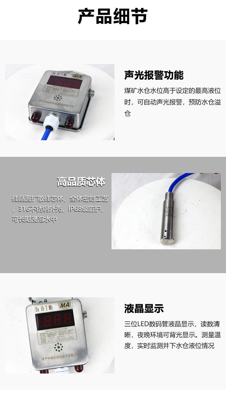 济宁华瑞GUY10(A)煤矿用投入式水位计井下水位监测矿用投入式液位计是采用半导体差压敏感测量探头制成的投入式智能投入式液位测量仪表。该仪器适用于煤矿井下水仓投入式液位的测量以及其它需要测量投入式液位的场所。仪器采用红外线遥控调校,无调节孔,密封性能良好。