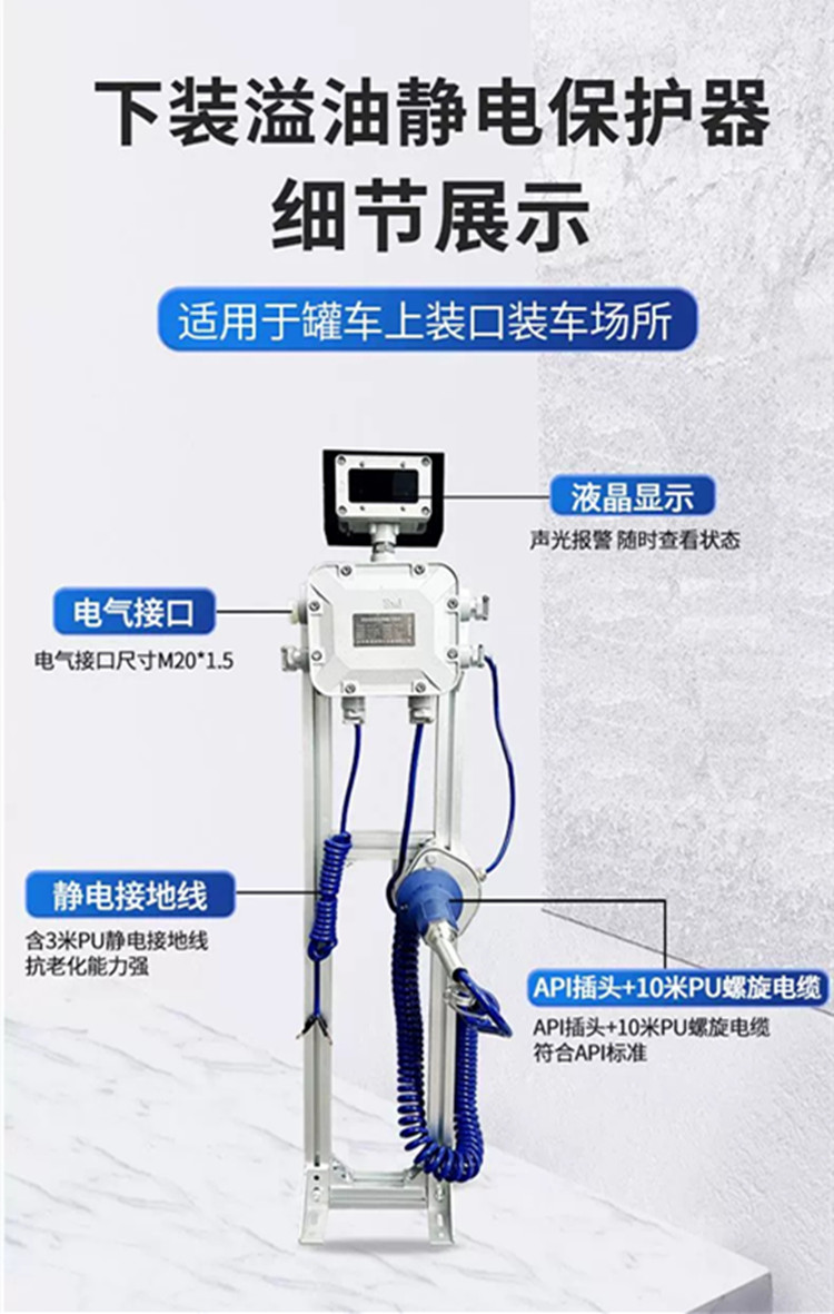 底装防溢流防静电控制器是专为顶部付油系统设计,能有效防止液体溢出并保证接地电阻符合安全标准的仪器仪表,组成石油化工产品储运过程中的防溢流防静电系统。