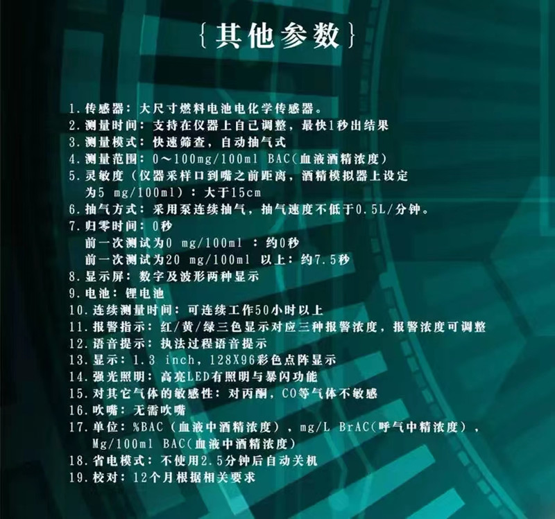 11. 灵敏度:具有极高的灵敏度,可以进行遥测,不需要被测人吹气配合也能完成测量。在进气口距离被测人口鼻20cm时还能在3秒内检测到呼出气中低到5mg/100ml的酒气。
