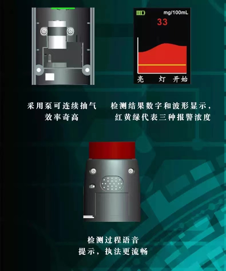 3. 语音播报:开机及测量时采用喇叭进行语音播报,播报内容包括“请吹气”“谢谢您的配合”,“对不起,您喝酒了”等。