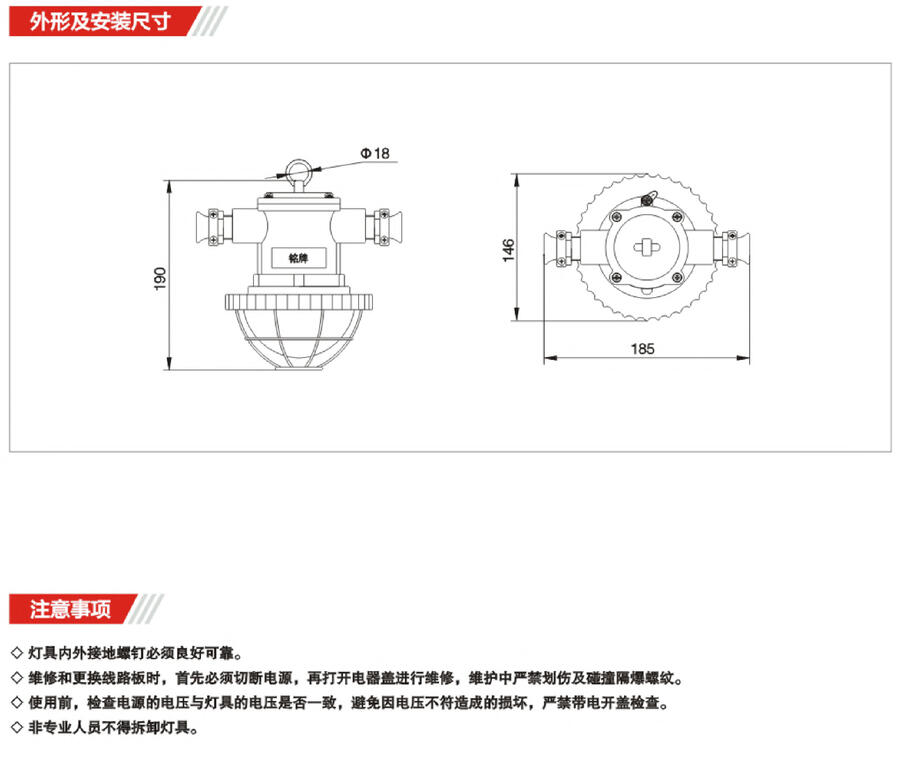适用于有甲烷、煤尘等爆炸性混合物气体的煤矿井下巷道及硐室内做固定式照明。