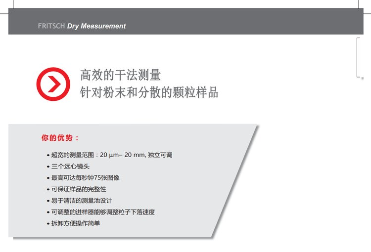 测量速度 | 最高可达75快速图像分析用于颗粒粒型及粒度分析张/sec | ||