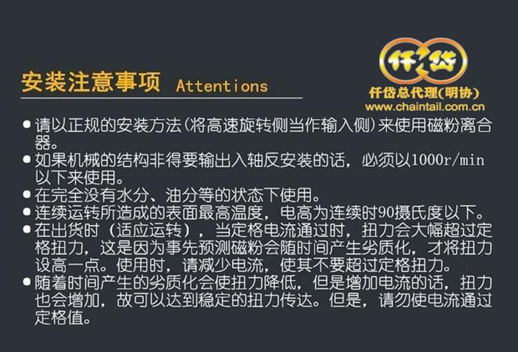 磁粉离合器重量为:5.2KG,允许转速为1800转/分钟,磁粉重量为20克。