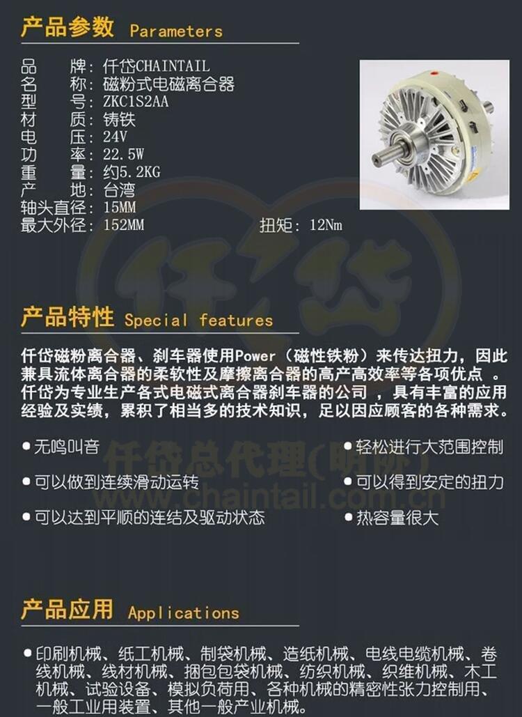 台湾仟岱全自动贴窗机磁粉离合器ZKC1S2AA,仟岱有限公司大陆仟岱总代理可提供仟岱牌磁粉离合器,磁粉刹车器,DC24V,配合明协牌MX02-4A手动张力控制器使用,广泛应用于绕线机,拉丝机,全自动贴窗机,高速绞线机等行业。