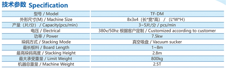 工作原理:夹芯板主机切割成品后,自动传送到垛码机设计的位置,感应到板料到位,垛码吸盘启动,真空吸盘抓起板料转移设计的位置上实现堆垛起来,堆垛高度机器可适应调节,堆垛平正,堆垛成型完后机器会自动报警提示完成。
