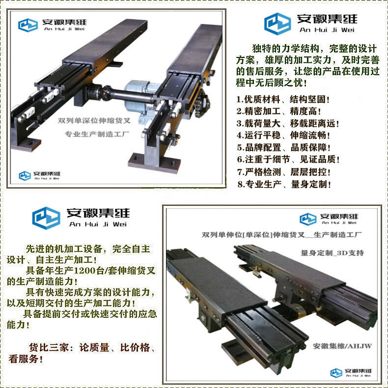 安徽集维智能装备有限公司[马鞍山市]是一家集研发、生产、销售为一体的伸缩货叉生产制造厂家,拥有完整的质量管理体系、多位资历深厚的工程设计师和经验丰富的技术团队,全套的机加工设备,自主设计、自主生产,具备年生产1600多台套伸缩货叉的制造能力,具有快速完成方案的设计能力,以及短期交付的生产加工能力,具备提前交付或快速交付的应急能力!