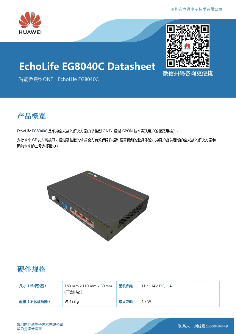 EchoLife EG8040C 是华为全光接入解决方案的桥接型 ONT,通过 GPON 技术实现用户的超宽带接入。支持 4 个 GE 以太网接口,通过高性能的转发能力有效保障数据和高清视频的业务体验,为客户提供理想的全光接入解决方案和 面向未来的业务支撑能力。